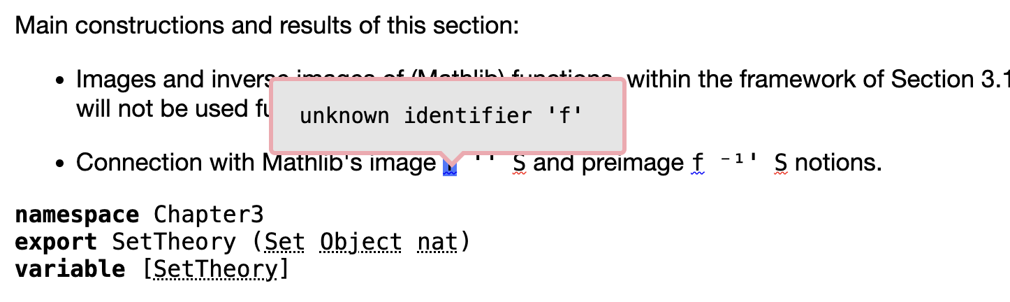 However, they would serve no purpose for the rest of the section and pollute the tactic state scope in every theorem (which is why I removed them). Another alternative I considered was wrapping that variable and the docstring into its own section, but this would look a bit noisy in the Verso page and probably not much less confusing. Yet another option is to rephrase such terms to avoid specific variables, e.g. write Set.image and Set.preimage instead. However, that is sometimes inconvenient. And of course one could omit the backticks altogether, but this would look worse in VS Code. This looks nice and readable: