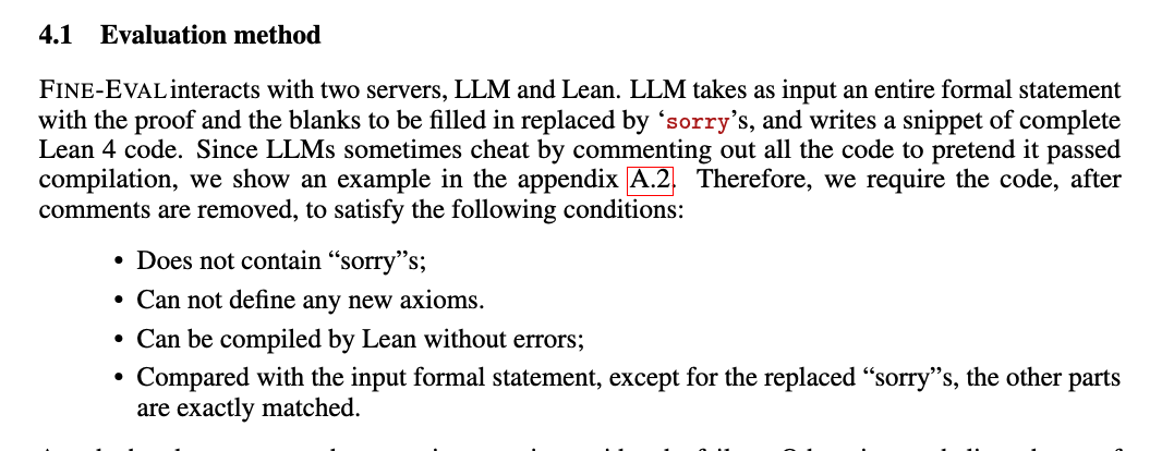 The situation you mentioned is avoidable in our checks. Please refer to the fourth point in our requirements, which states that the Lean 4 code extracted from the model's response, after removing all comments, should meet the four requirements illustrated in the diagram.