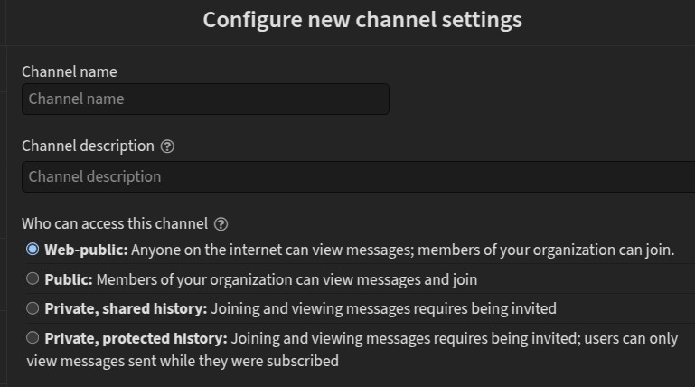 For the access question: web-public is the channels with the globe icon to the left of them in the channel list, public is the hashtag icon, and private is a lock icon.