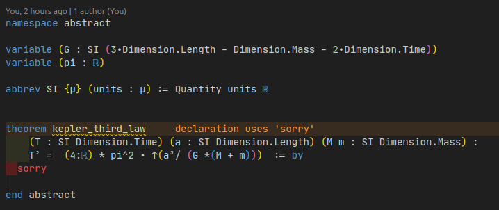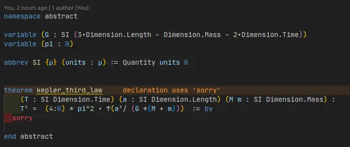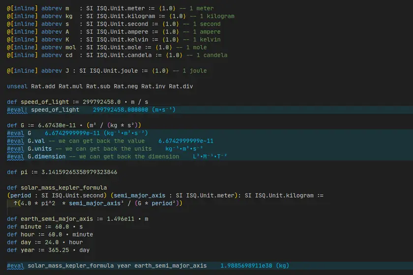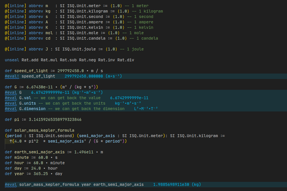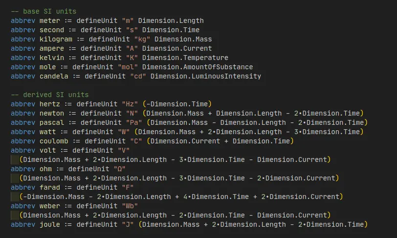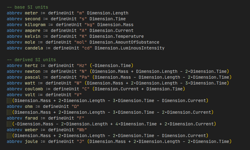 So i redesigned it to be based on Base SI units. And it makes more sence like that. Only base units should be a choice of unit .-- base SI units abbrev meter := defineUnit "m" Dimension.Length abbrev second := defineUnit "s" Dimension.Time abbrev kilogram := defineUnit "kg" Dimension.Mass abbrev ampere := defineUnit "A" Dimension.Current abbrev kelvin := defineUnit "K" Dimension.Temperature abbrev mole := defineUnit "mol" Dimension.AmountOfSubstance abbrev candela := defineUnit "cd" Dimension.LuminousIntensity abbrev steradian := defineUnit "sr" Dimension.dimensionless -- derived SI units abbrev hertz := defineDerivedUnit "Hz" (-second) abbrev newton := defineDerivedUnit "N" (kilogram + meter - 2•second) abbrev pascal := defineDerivedUnit "Pa" (newton - 2•meter) abbrev joule := defineDerivedUnit "J" (newton + meter) abbrev watt := defineDerivedUnit "W" (joule - second) abbrev coulomb := defineDerivedUnit "C" (ampere + second) abbrev volt := defineDerivedUnit "V" (watt - ampere) abbrev ohm := defineDerivedUnit "Ω" (volt - ampere) abbrev farad := defineDerivedUnit "F" (coulomb - volt) abbrev weber := defineDerivedUnit "Wb" (volt + second) abbrev tesla := defineDerivedUnit "T" (weber - 2•meter) abbrev henry := defineDerivedUnit "H" (ohm + second) abbrev lumen := defineDerivedUnit "lm" (candela + steradian) abbrev lux := defineDerivedUnit "lx" (lumen - 2•meter) abbrev becquerel := defineDerivedUnit "Bq" (-second) abbrev gray := defineDerivedUnit "Gy" (joule - kilogram) abbrev sievert := defineDerivedUnit "Sv" (joule - kilogram) abbrev katal := defineDerivedUnit "kat" (mole + second) abbrev celsius := defineDerivedUnit "°C" kelvin (Conversion.translate (273.15))