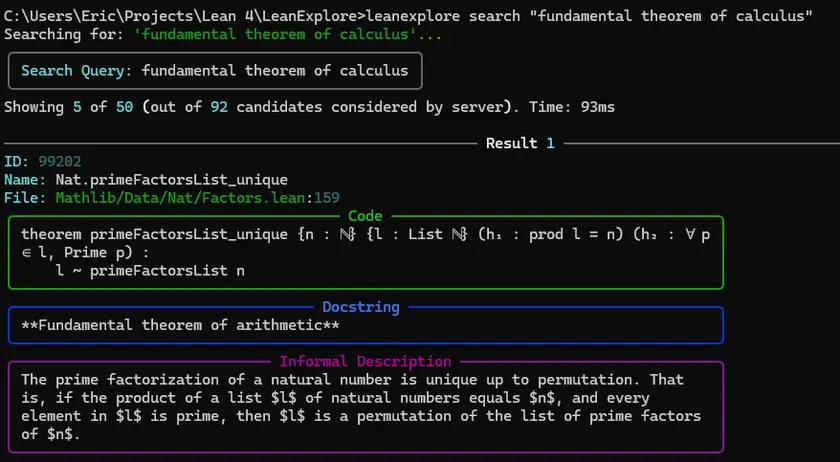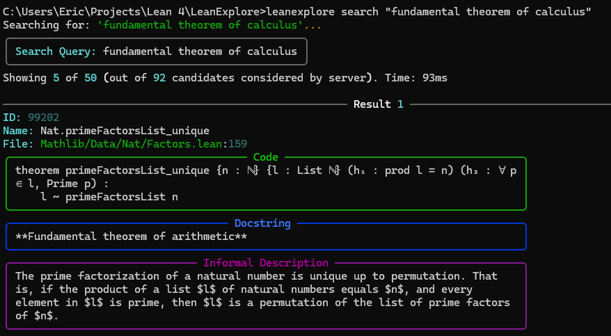 My original goal was be able to search Lean semantically, so that people can find statements in English. Hence, I indexed (i.e., embedded) the Lean code, the docstrings, and the and the Gemini translations, each as their own item in the search tree.