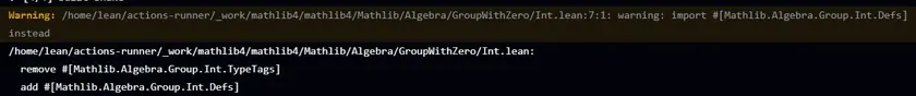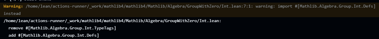 Warning: /home/lean/actions-runner/_work/mathlib4/mathlib4/Mathlib/Algebra/GroupWithZero/Int.lean:7:1: warning: import #[Mathlib.Algebra.Group.Int.Defs] instead