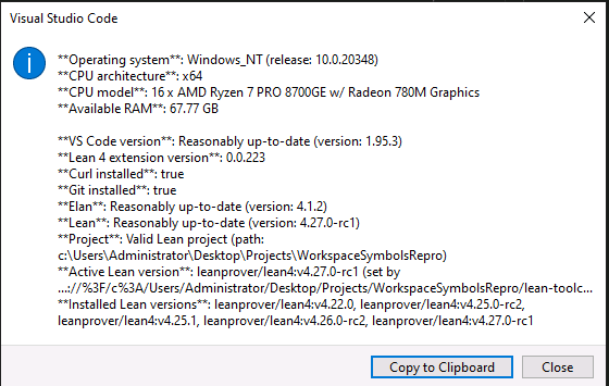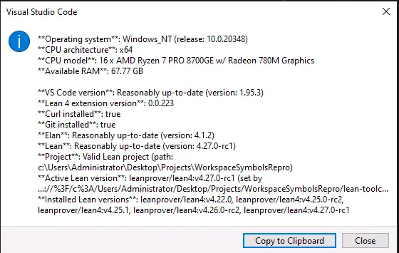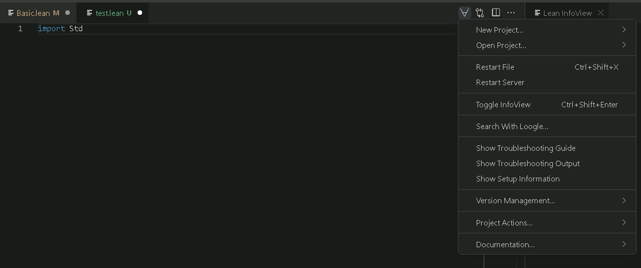 - VSCode did not manage to find the lean executable in ~/.elan/bin. This was not rectified by running the 'install using elan' prompt. I fixed this by explicitly setting the lean executable vscode setting, but that took a couple of attempts because you had to use the windows-style path not the bash-style path.