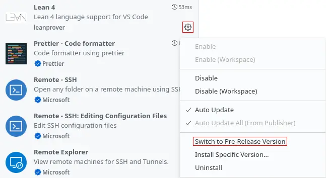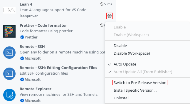 I'd be very grateful for any help with testing this pre-release before we roll it out to everyone. You can install the pre-release by opening the 'Extensions' side-bar view, clicking the cog icon on the 'Lean 4' extension and selecting 'Switch to Pre-Release Version':