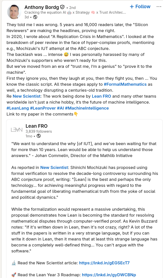 I could give a far harsher talk where I point out various serious mistakes by prestigious people and then point to various recent extremely technical papers by these same people which I know because of insider information did not go through as rigorous a refereeing process as they should have done and then flat out accuse the mathematical community of not having done its job correctly. I am not sure who is the crackpot but recent events in number theory have made me start to firmly believe that it's not me but them. I have thus far refrained from telling such stories in public, but believe you me this is why I am here in the formal proof verification community.