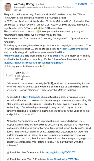 www.youtube.com/watch?v=IKjfrFMjz08 large channel but a pretty shocking video , covering a lot of the developments with Erdos problems and AI companies but somehow not mentioning Lean and seemingly confused about how Boris’ Erdos problem discovery worked.
