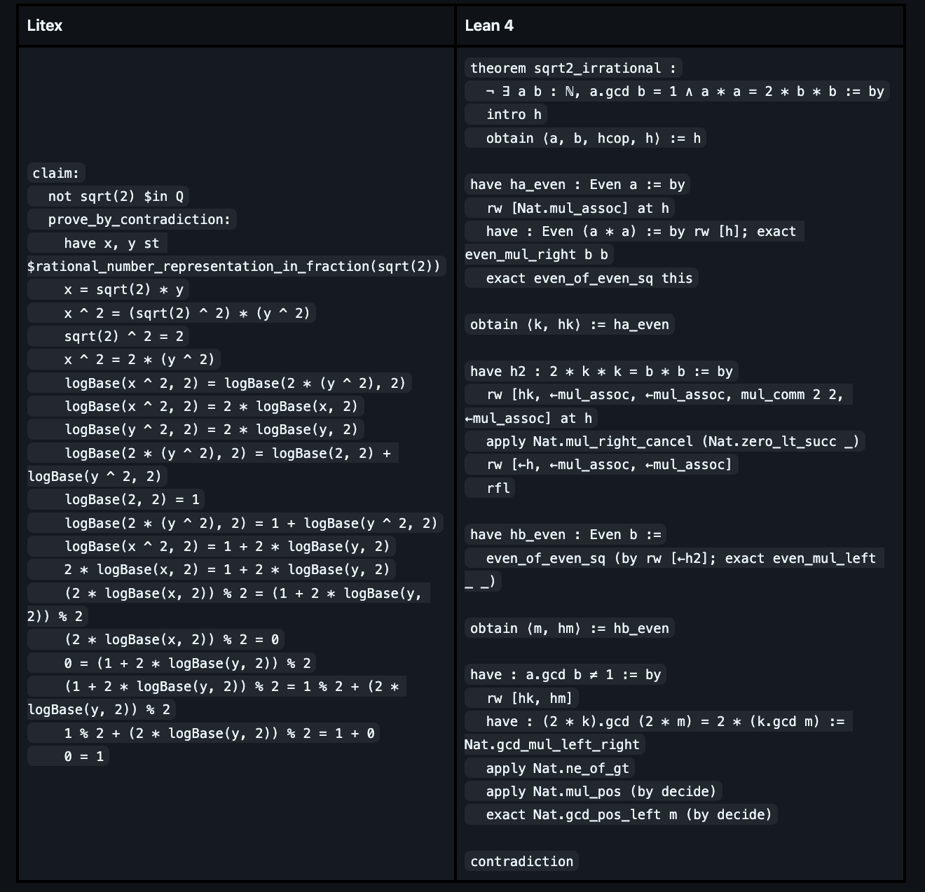This week I implemented basic features to formalize √2 ∉ ℚ and ℝ, Z ∈ Group in Litex. Visit https://litexlang.org/playground to try the following examples. Visit my Github https://github.com/litexlang/golitex (star this repo :star: !) for more detailed introduction to Litex. Join our zulip https://litex.zulipchat.com/join/c4e7foogy6paz2sghjnbujov/ for discussions. The email is litexlang@outlook.com.