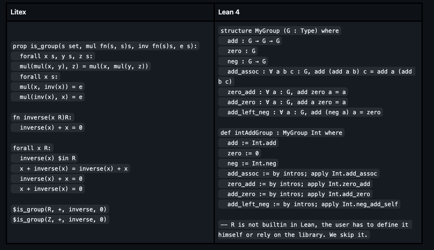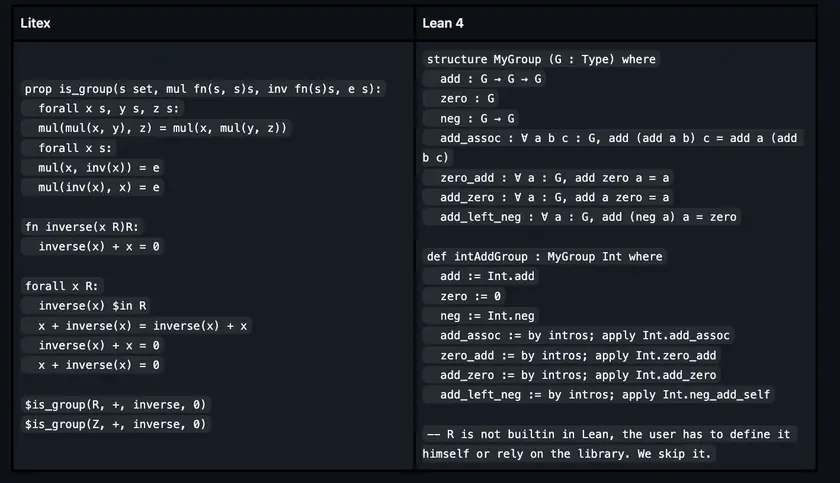 Thank you for your comment, Eric. I removed the float example. The reason why I want to prove that both ℝ and ℤ are groups is that function type narrowing is automatic in Litex, which is very convenient and uncommon in most formal languages.