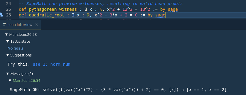 -- SageMath can provide witnesses, resulting in valid Lean proofs