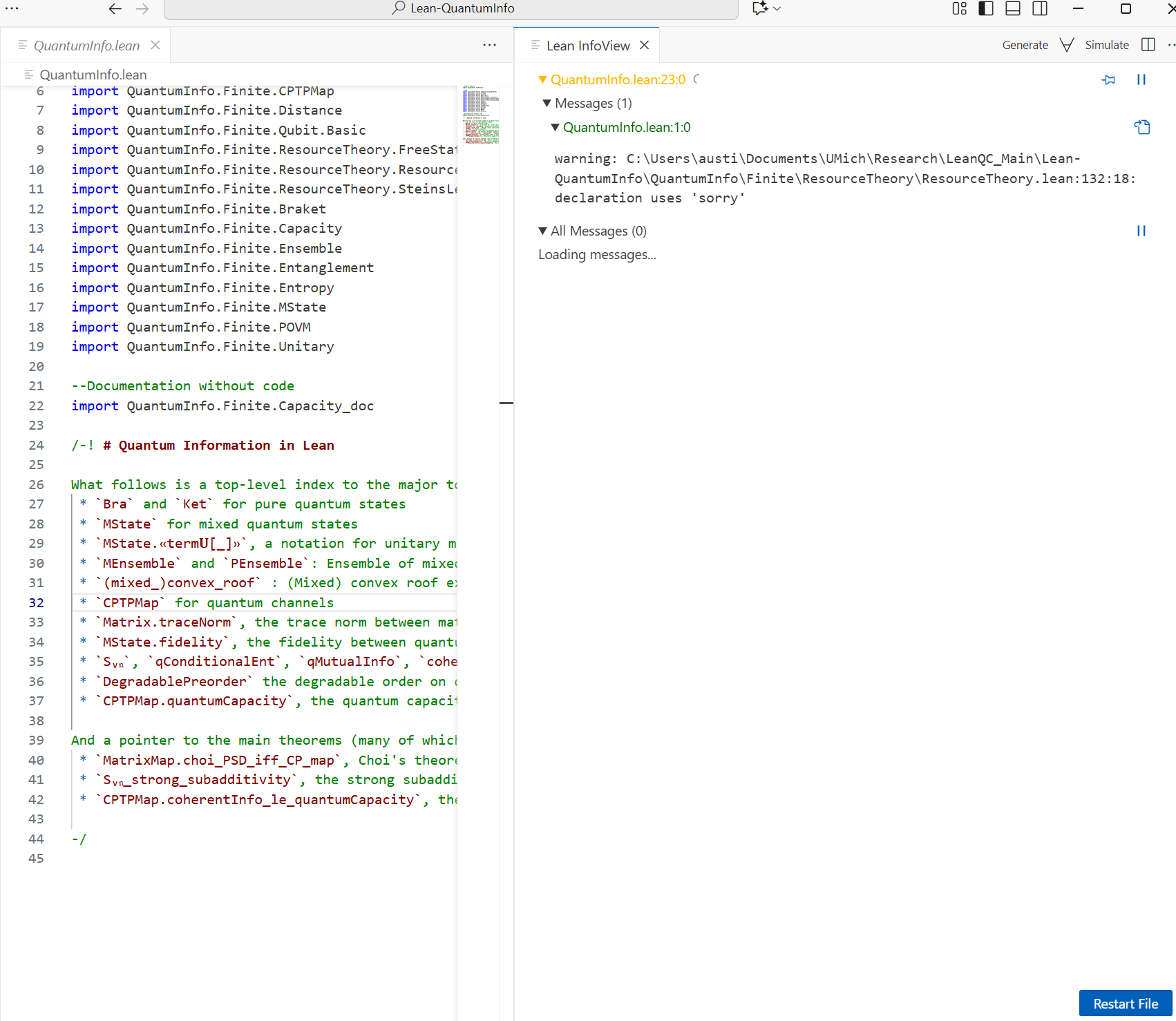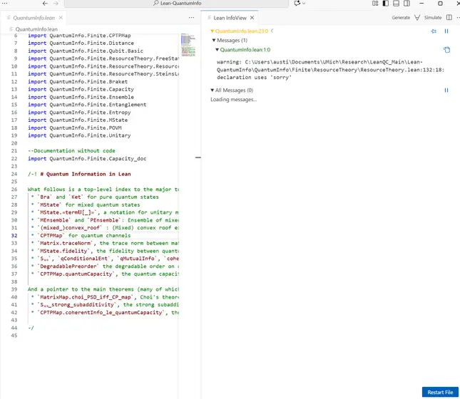 I've been trying to run the file from this repo: https://github.com/Timeroot/Lean-QuantumInfo/blob/main/QuantumInfo.lean. However, the file has been loading for over 6 hours without finishing. Would the warning shown on the screen be enough to stop the process, or should it still eventually complete?