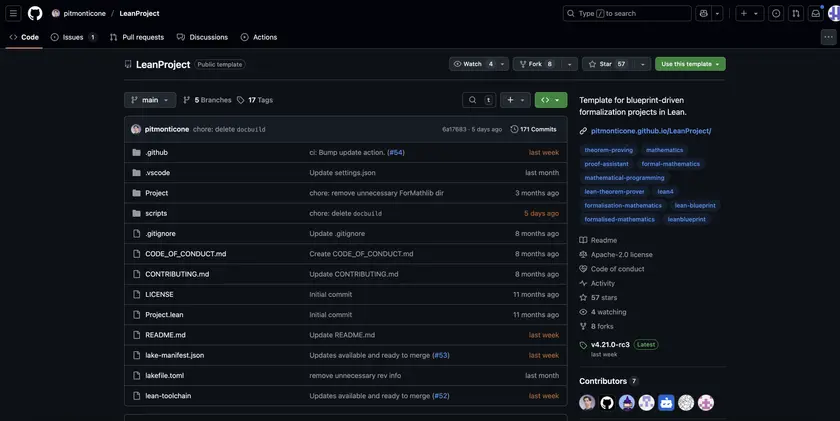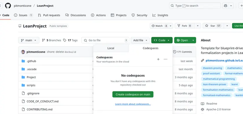 For instance if you want all the blueprint and CI bells and whistles, go to this link : https://github.com/pitmonticone/LeanProject