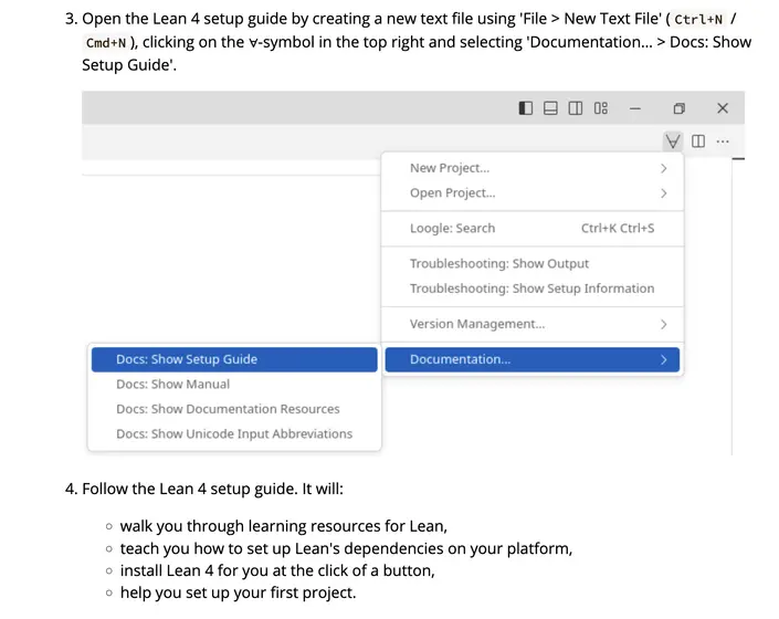 Setting up a Lean project could be included in that step too, but I think that's less important. Different users may want different things--some will want to open an existing project (perhaps a project that comes with the book they are reading) and some will want to create a new project, either depending on Mathlib or not. We already have the "New Project" and "Open Project" commands in VSCode. I haven't played with those much, but if they're user-friendly enough, then perhaps there is no need to include setting up a project in the installation step. After all, installing Lean and setting up a project are, conceptually, two different things.