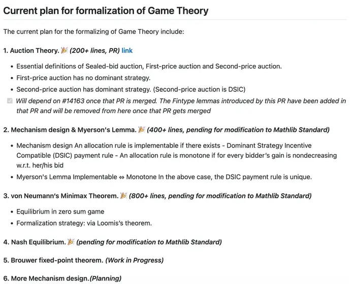 The Nash equilibrium formalization is indeed a key part of our overall game theory plan. Moving forward, we're planning to work on more game theory content, possibly complete more structural formalization content by autoformalization.