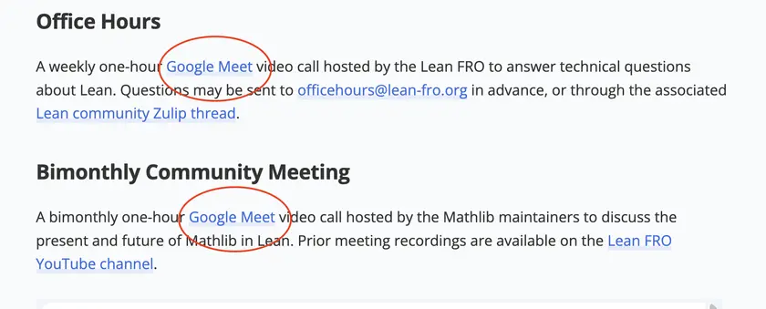 Quick note that the google meet link on the FRO website for office hours (https://lean-lang.org/community/) is wrong