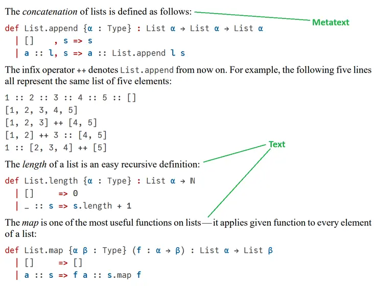 - Metatext is better than no text! I find documents with just adjacent code blocks and no text/metatext in between quite unreadable. (This is a personal preference. Others prefer terse "definition", "lemma", "proof" writing - or the Lean code equivalent of it.)