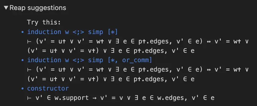 reapis super easy and convenient: just add the dependency,import Reapand it works. This is really nice! reapis nondeterministic, so it's useless to keep it in your main proof script. So I thinkreapshould just do whatreap?currently does: give suggestions for replacements- It seems that