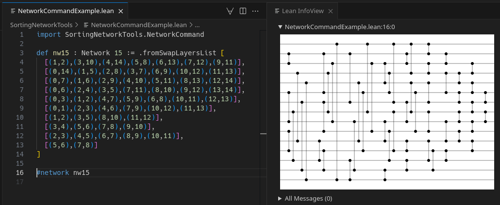 Hi everyone. I used Lean to make a suite of tools for evolving, verifying, and visualizing sorting networks. The tool can be found on GitHub (warning: alpha stage; expect some jank.)