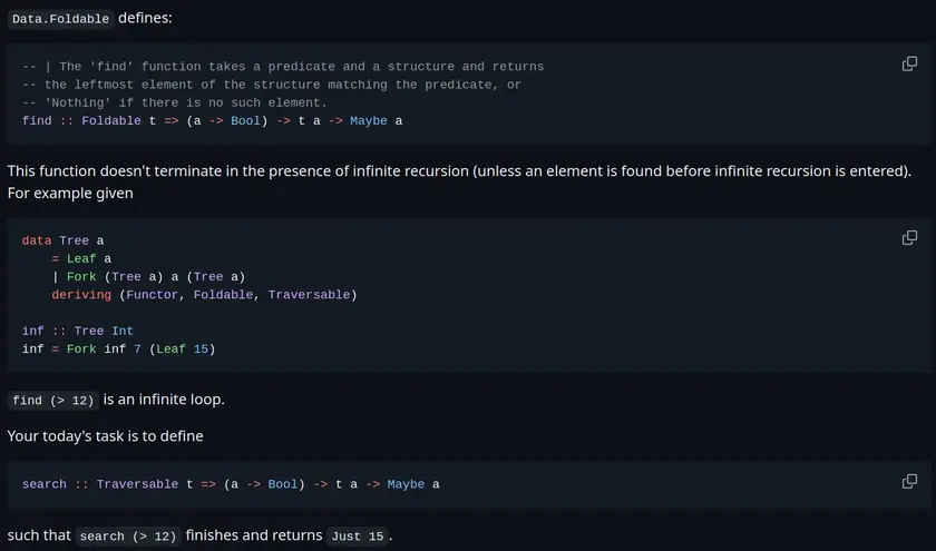 This was a lovely puzzle + thread, about how to efficiently search over a tree (or more generally, any Traversable) to find an element matching a predicate - given a guarantee that there is one.