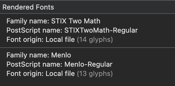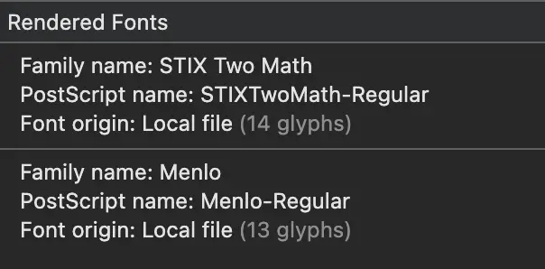 (the 14 Menlo glyphs are the spaces I put between the math symbols)