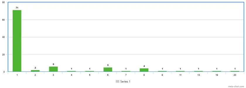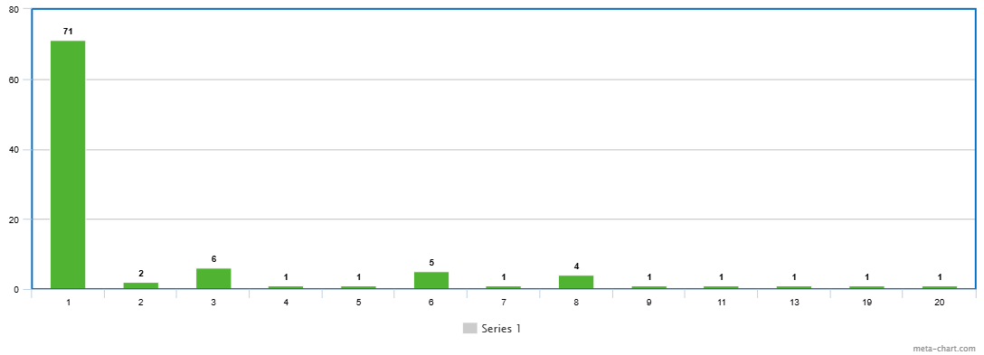 i.e. most (71) of the proofs/definitions are 1 line long, but there are also a few that go up to 19 and 20 lines long