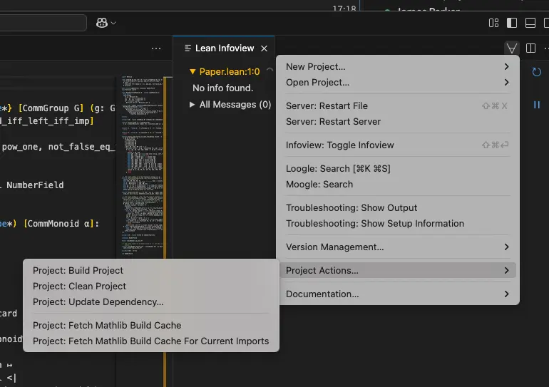 in this menu, clicking Project: Clean Project followed by Project: Fetch Mathlib Cache should be the equivalent of what I asked in that line.