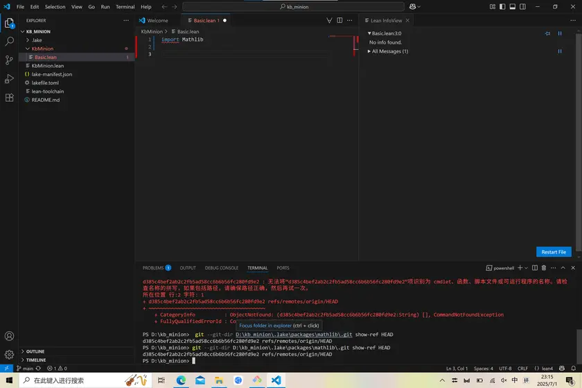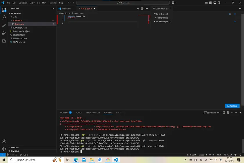 If so, in that command line window that popped up there try running git --git-dir D:\kb_minion\.lake\packages\mathlib\.git show-ref HEAD