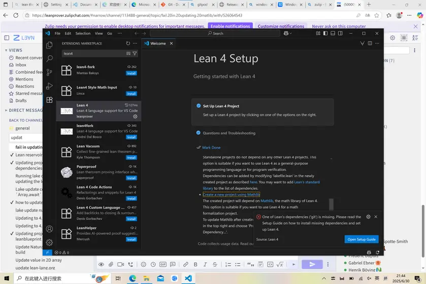 Hi! I set up a new account without Chinese character and tried to redownload everything like VsCode and Git again to make it work. Now I successfully downloaded VsCode and Git, but it still gave me an error message saying Git is missed.