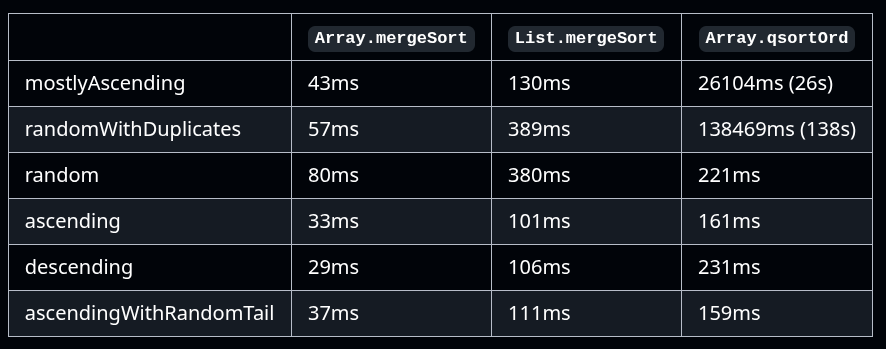 This is true and it is still going to take O(n) extra space unlike docs#Array.qsort . @Asei Inoue you will definitely need one extra array. There are complicated variations on merge sort that would save you this extra space but some of those aren’t even technically called merge sort. See block sort or glide sort for example.