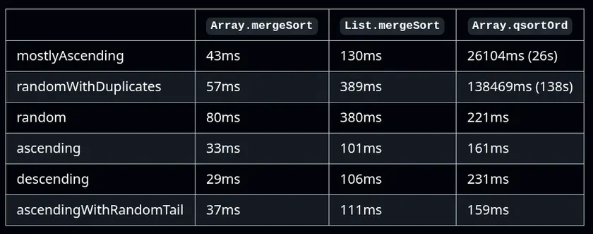 One note: Array.qsort is implemented in Lean, not Mathlib. It also has a problem, that it is slow for already sorted lists, because it uses a pretty basic qsort algorithm. It is easy to fix at the algorithm level, less easy to replace the existing verification that qsort is correct (which, if I recall correctly, only lives in Lean's test suite rather than its library).