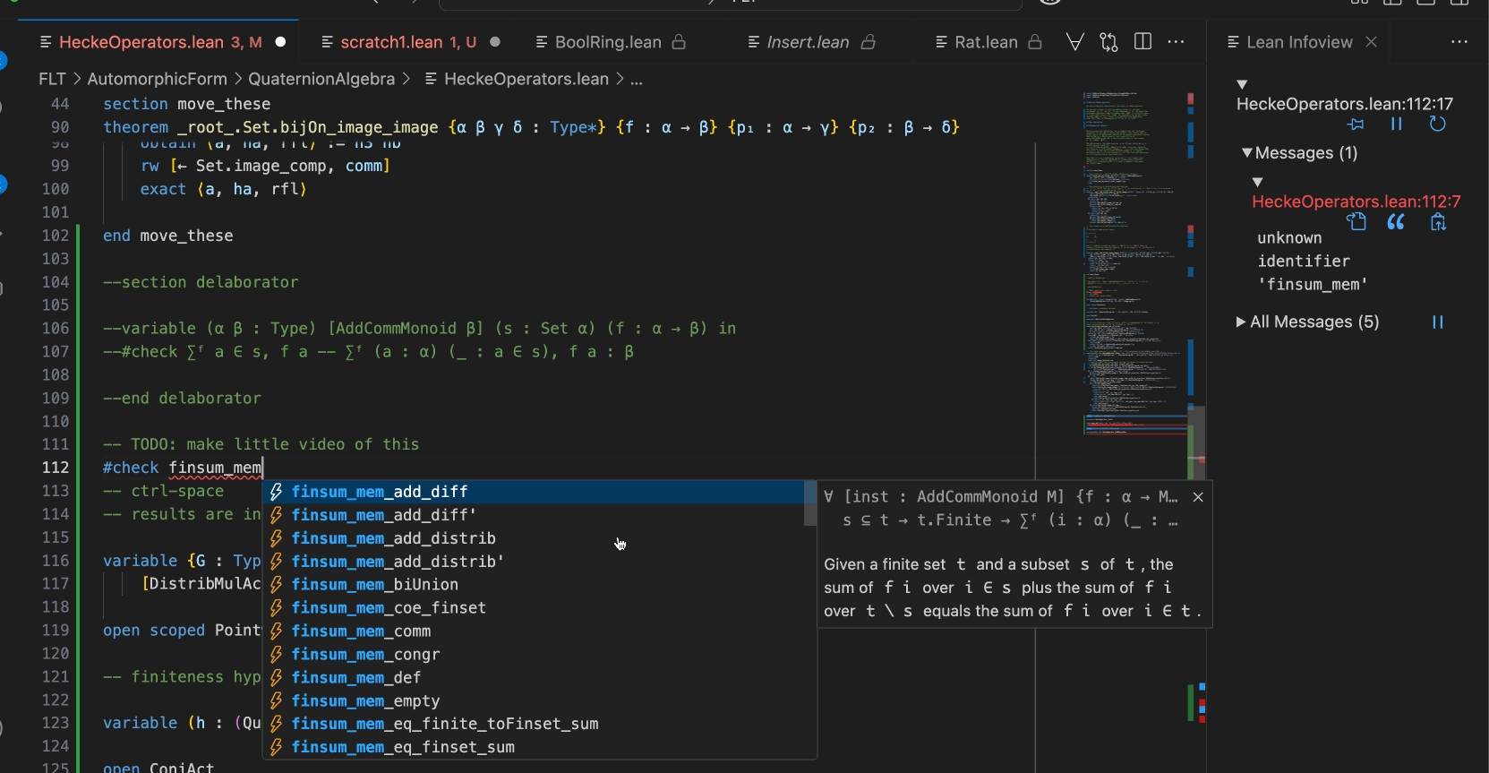 I often use ctrl-space to give me suggestions for the lemma I'm looking for. But the output is totally weird to me. Frequently I do not see the full type of the suggested lemma, VS Code cuts it off after a few lines. In the gif example attached, you can see that sometimes 5 lines are displayed and sometimes two. Can I persuade VS Code to just tell me the type of the lemma, rather than just giving me the list of typeclasses in the input and then truncating after two lines? You can see in the video that sometimes VS Code displays 2 lines, and somtimes 5, and I can see no rhyme or reason for the choice. I would like to see "as much as possible" and there is clearly room to display this. I can hover over the output to see the full type but the font size is too tiny for me to read and I don't know how to increase it, and I don't really want to hover anyway, I just want to see the output on the font size I've selected. Am I making sense? Why is VS Code sometimes only displaying two lines of output and sometimes 5? Concrete example: why can't I see the full type of finsum_mem_congr