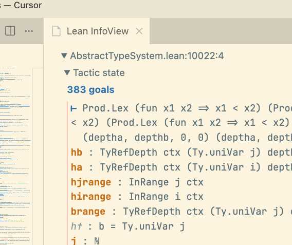 I believe that the idiomatic way to prove that this decreases would be in the decreasing_by block, but that leads me to the next problem: that for some reason there are 383(!!) goals there for me to prove. This makes zero sense to me. There are 11 recursive calls, and I provide all required parameters upfront on every call (i.e. I don't leave any ?_s to fill in later by case matching on anything).