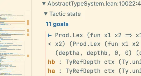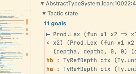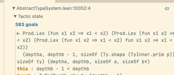 hdepthseqandhsizeslthypotheses come in. But as you can see it doesn't help:... hdepths : ¬depthFstA < deptha hdepthseq : depthFstA = deptha hsizeslt : sizeOf fstA < sizeOf a ⊢ depthFstA < deptha