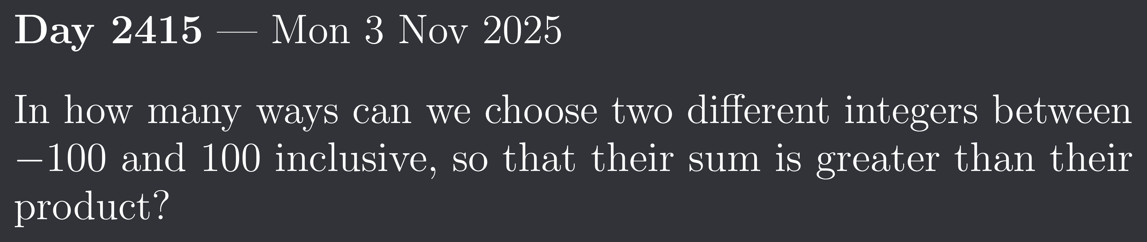At this point I'm wondering whether it's just easiest to demand − 100 ≤ a < b ≤ 100 -100\leq a<b\leq 100 − 100 ≤ a < b ≤ 100 and have done with it; otherwise you'll just end up with several lines of boilerplate reducing you to this case at the beginning of the proof, which is enough to put people off. Clearly this rephrasing is equivalent.
