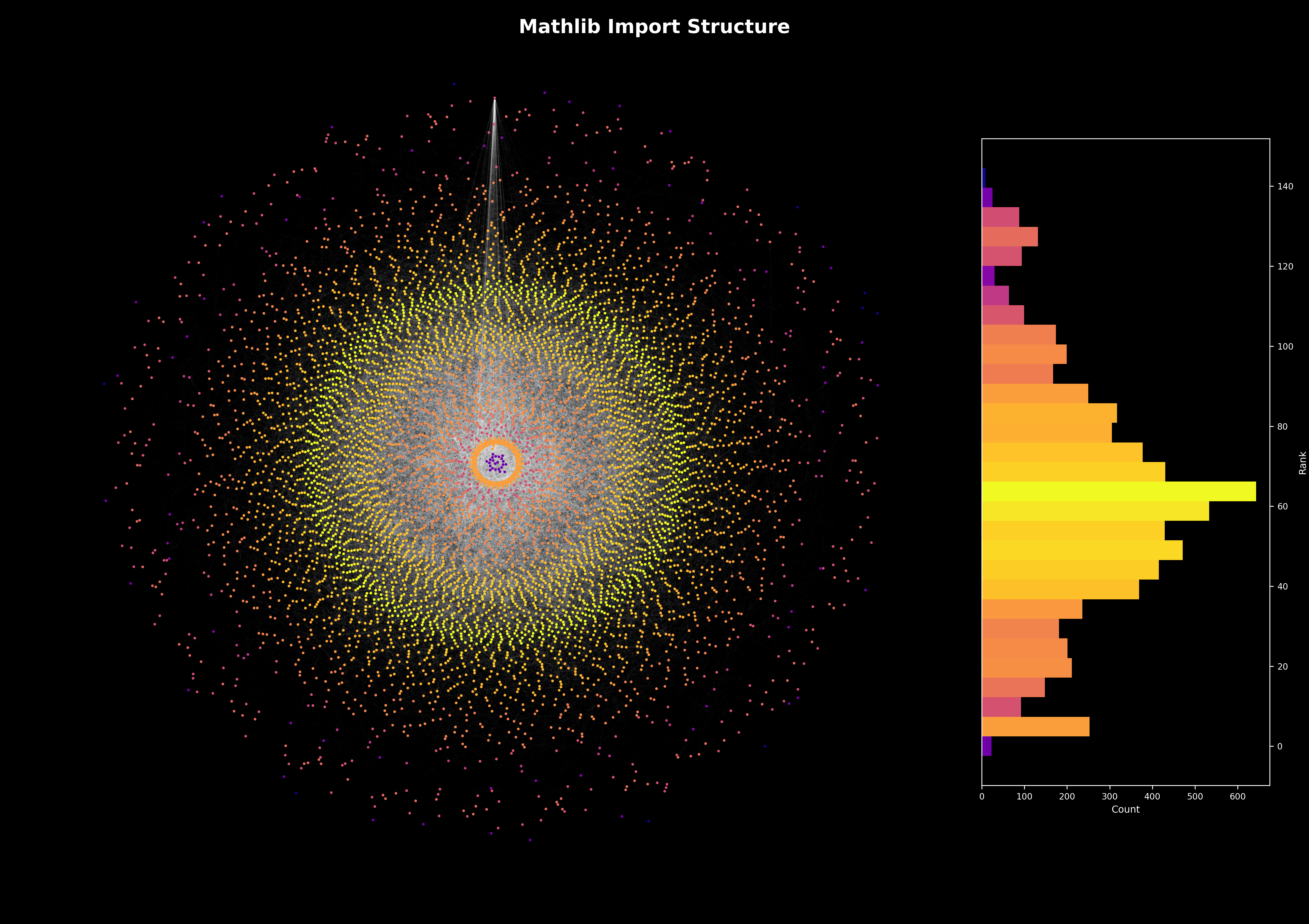 Naively, this confirms your framing: we don't really need to chase all the way down (or up) for most mathematics -- and accordingly, people would probably be happier ignoring those files at first. Next up I'll be exploring more structure than just the import graph, but one last image highlighted by histogram.
