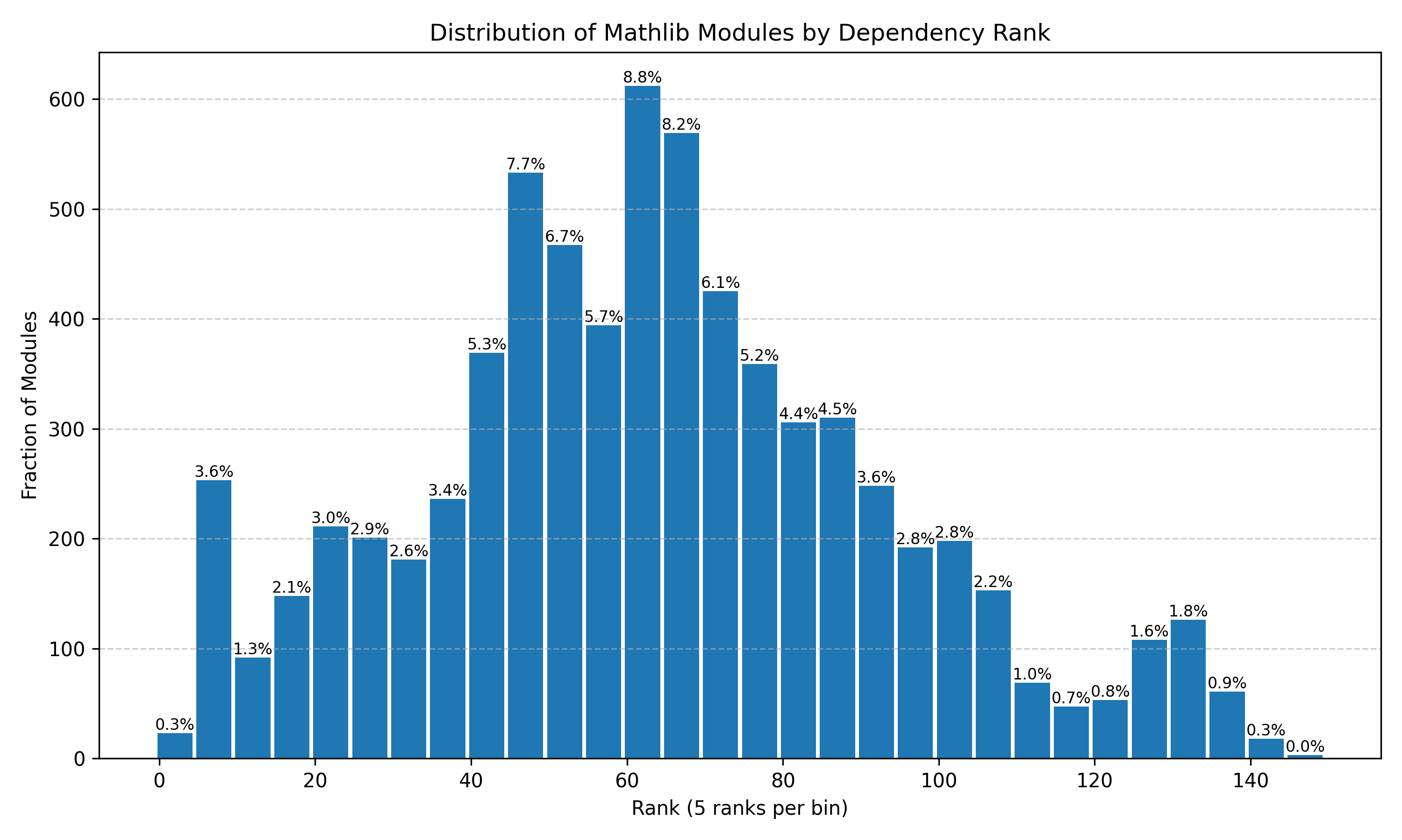 One way is by looking at patterns (such as the above histogram) which tell us how the graph clusters (eg, 55% of Mathlib modules cluster in the rank 40-80 range); another is using deeper graph analysis to look at topic clustering or highly utilized modules.