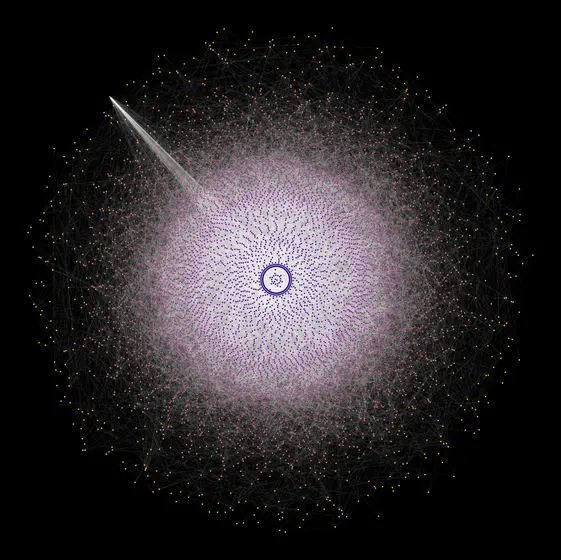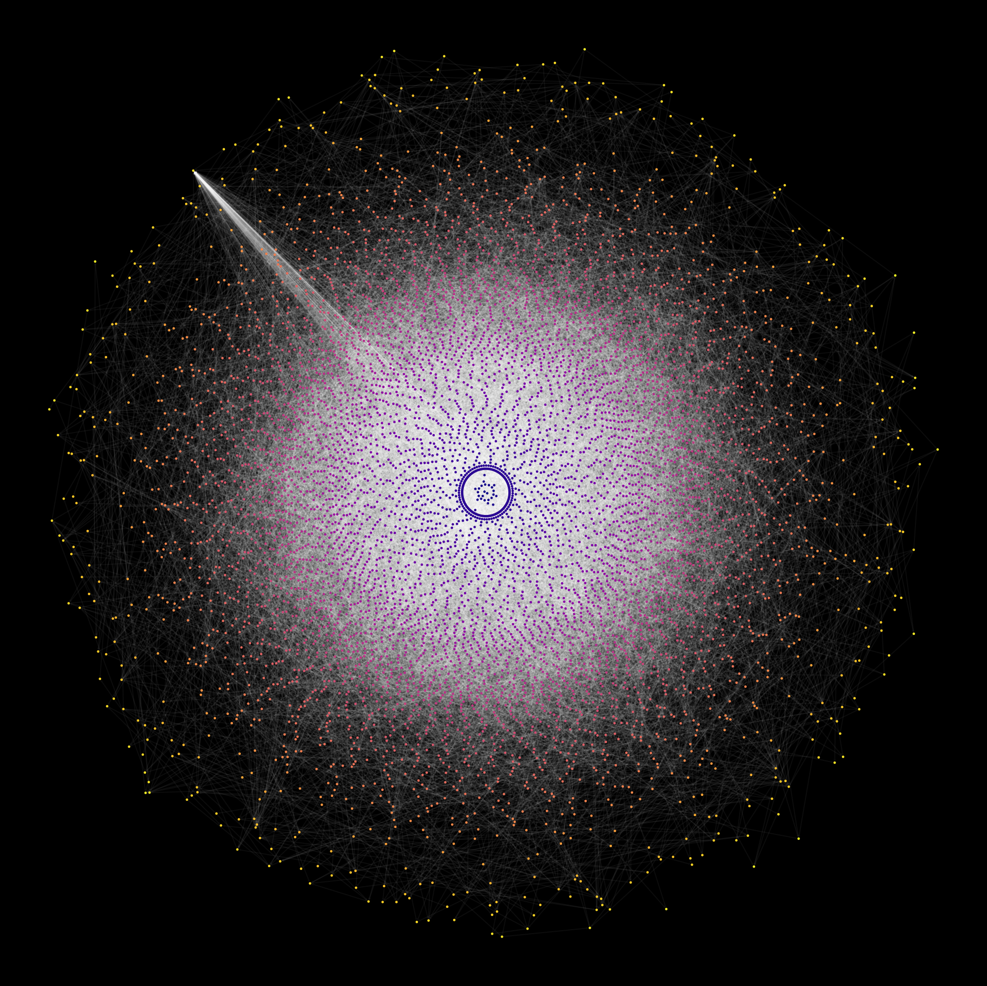Today I added a radial graph drawing where the nodes are colored by rank. Please excuse the faintness of the edges -- they completely wash out in the center if you turn it up higher.