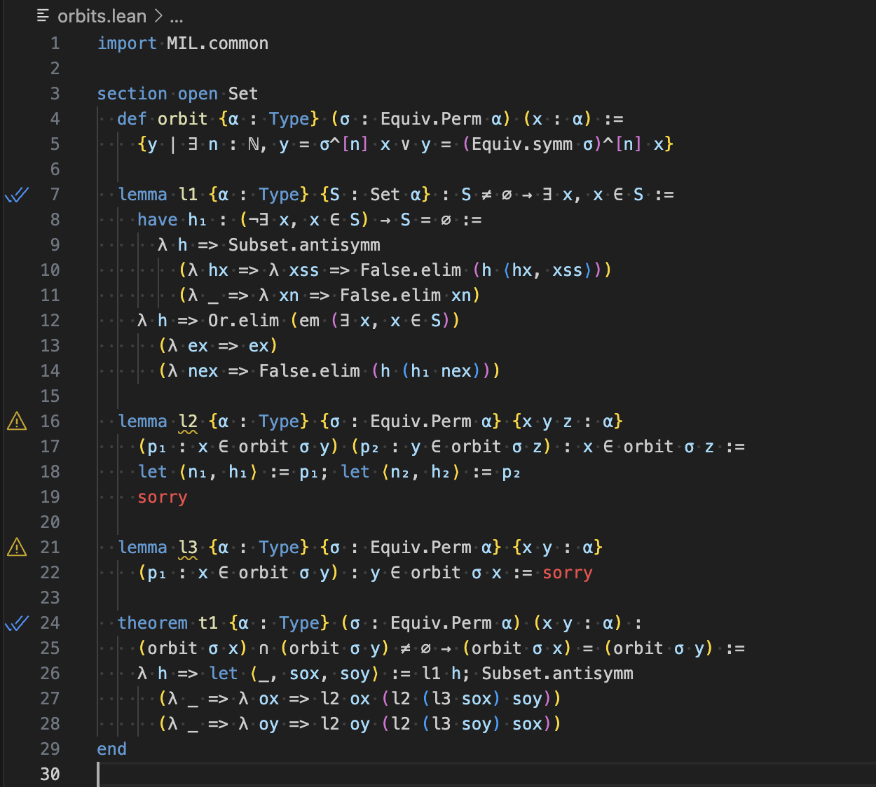 def orbit {α : Type} (σ : Equiv.Perm α) (x : α) :=