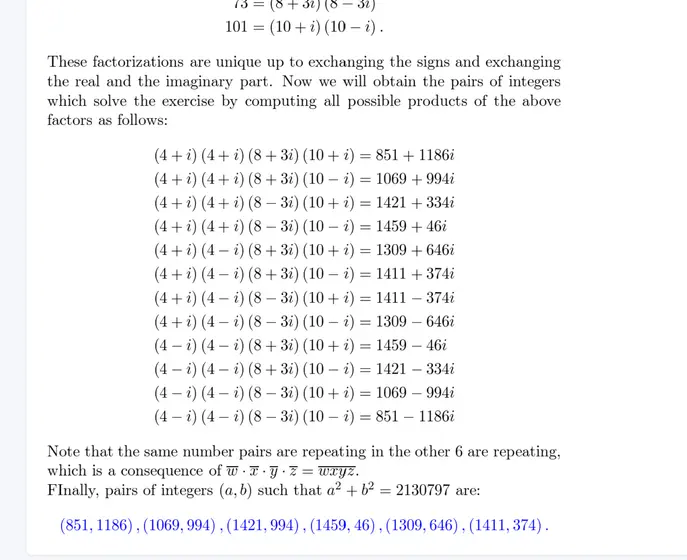 hello i try to solve Determine all the representations of the integer 2130797=172⋅73⋅101 as a sum of two squares. and