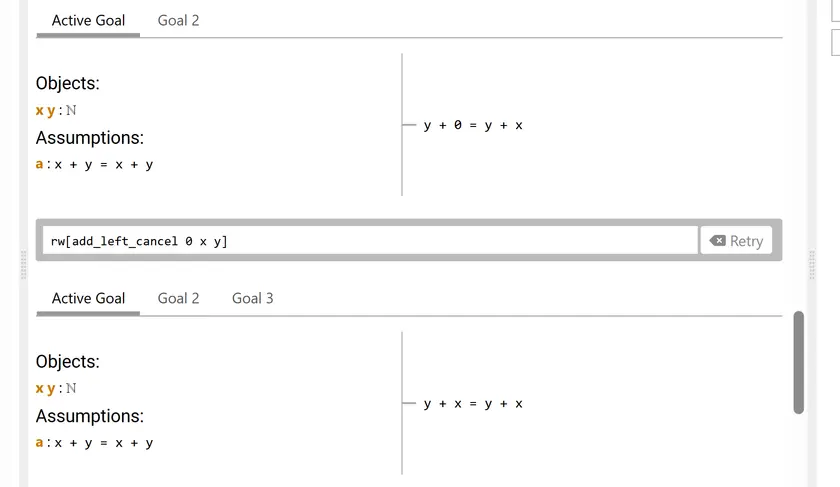 It created one more goal though. You had 2 goals before applying rw[add_left_cancel 0 x y], and after, you have 3 goals.
