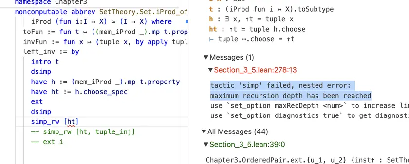 What I would have expected to see if some kind of runaway recursive stack which would tell me which @[simp] lemmas are going in circles.