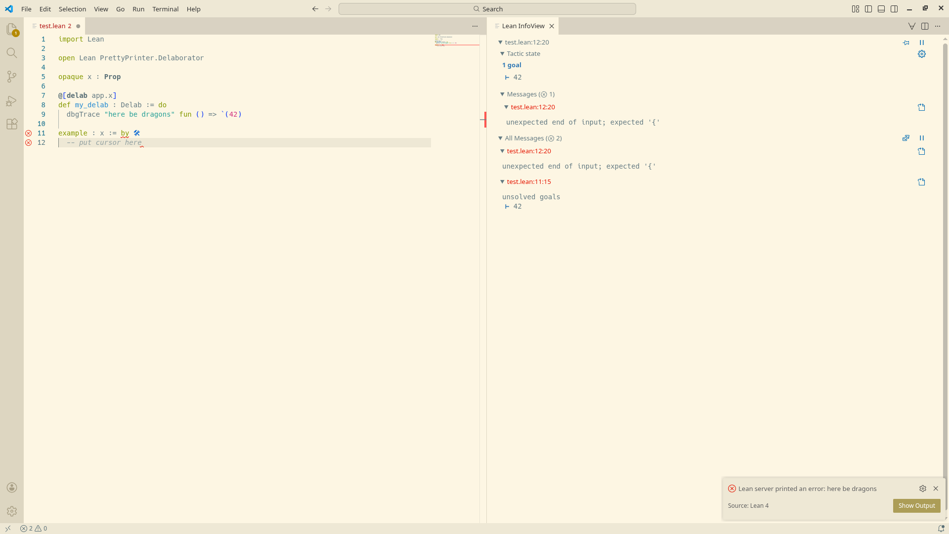With this code the message "here be dragons" is not found in infoview. Lean prints it on stderr. VS Code prints this in a notification.
