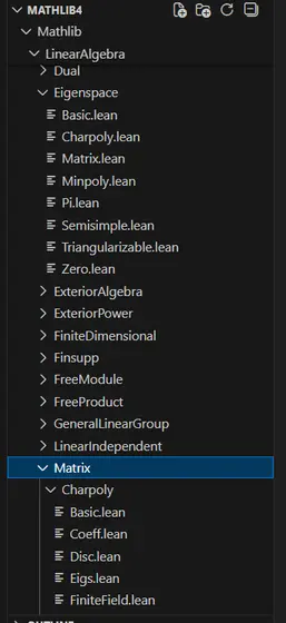 About mathlib, I would like to work on the missing linear algebra more specifically on endomorphisms. The thing is when looking up stuff that already exists regarding endormophisms, contrary to matrices there is not a specific folder for them. Some topics are directly inside the linear algebra folder (eigenvalue), some have their own folder (minpoly the website redirects towards the field theory folder but there exists also a minpoly.lean file under the linear algebra/eigensapce folder (a bit confused about that one)), some are inside the matrix directory.