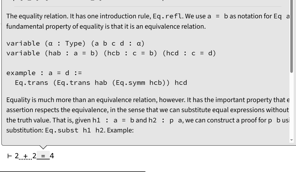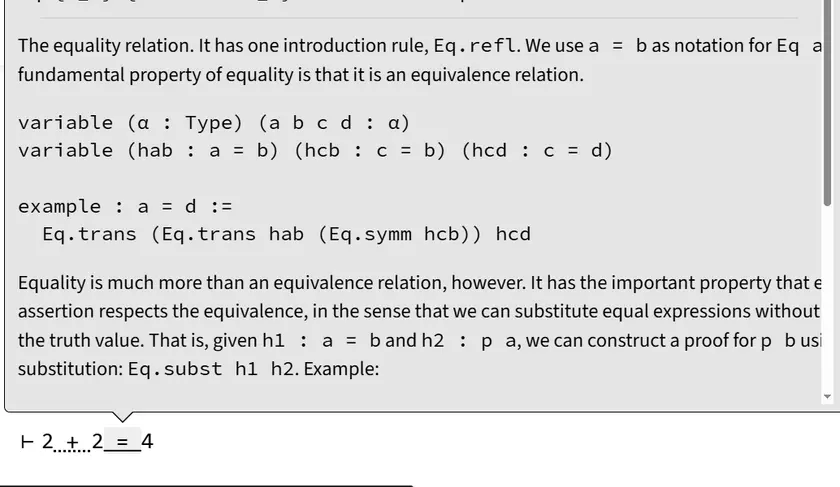 The contents of the tooltips mostly already occur in the text, because they're the signatures and API docs of the Lean library. Those that don't yet occur are on their way. Clicking a name should jump you right to its documentation and signature. The tooltips are really intended to be an extra redundant way to get to this information, without the overhead of clicking a link and leaving a context, rather than the primary source of it.
