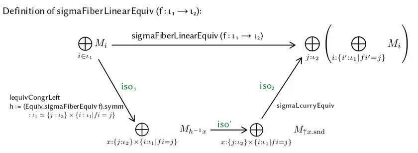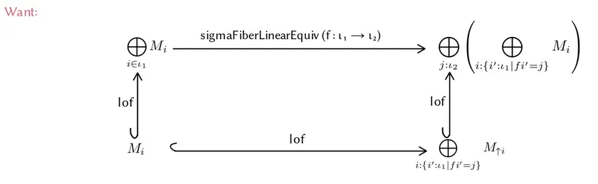 My idea is to define the isomorphism as a composition of two isos, to prove as lemmas that each iso is compatible with inclusions of summands (“lof”), and then to piece these two lemmas together. It's the last step (piecing them together) that fails. I post below the code I have, diagrams explaining my definition and my two lemmas (to myself if not to anyone else) and the error message I get.