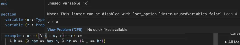 How do I solve this? λ h => ⟨λ hax => hax h, λ hr => λ _ => hr⟩ works, but I get an "unused variable" warning. Also, I don't understand the mathematical interpretation of this statement. If we were to say (∀ x ∈ S, r) ↔ r, this could be false if S were empty.