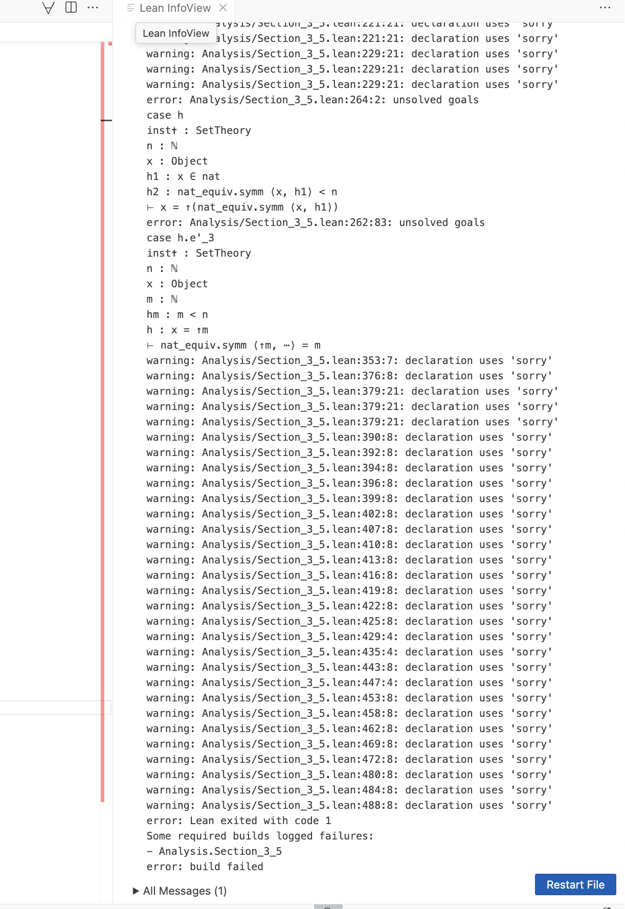 Basically, my problem with this is that it is easy to assume that the fault is in the file I'm working on (which is Section_3_6.lean, however it's actually in one of the dependencies (Section_3_5.lean) . I didn't even realize what these goals refer to unless you pointed them out. This is in a sense "user error" (I didn't correlate the logs to my files) but it is very disorienting because usually InfoView tells me information about what I'm looking at now. I never expect it to contain log spew from other files.