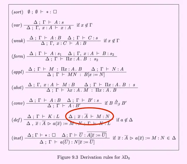 Chapter 8 introduces formal definitions, and Chapter 9 starts to extend λC to λD, by extending the derivation rules to incorporate formal definitions (link).