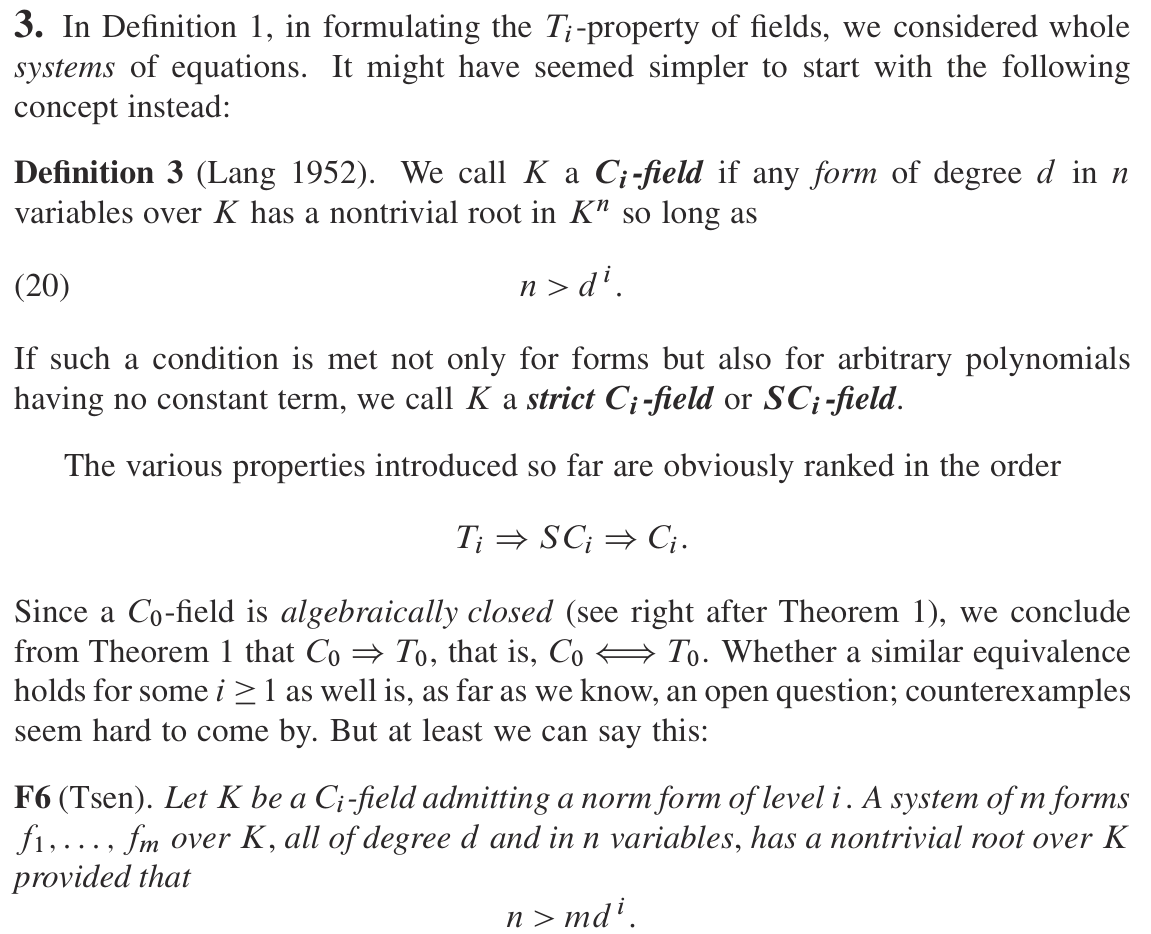- the field of rational functions k(T) is C1 when k is alg. closed ("Tsen's Theorem")
