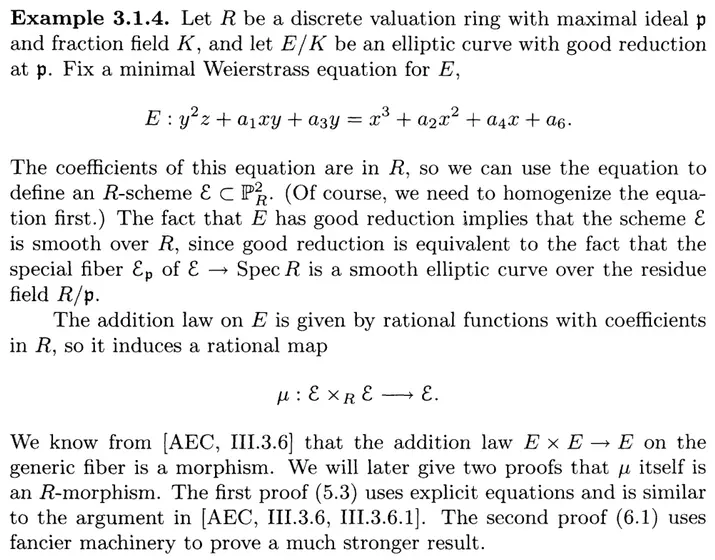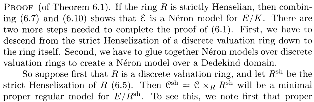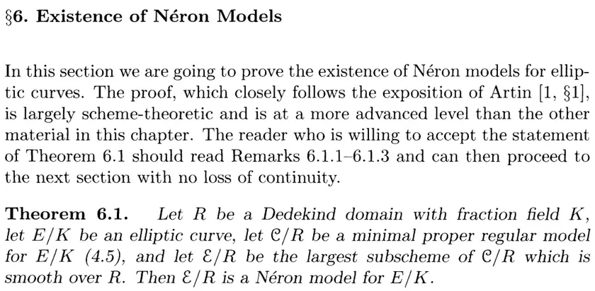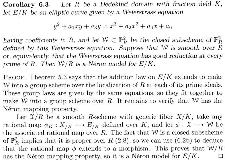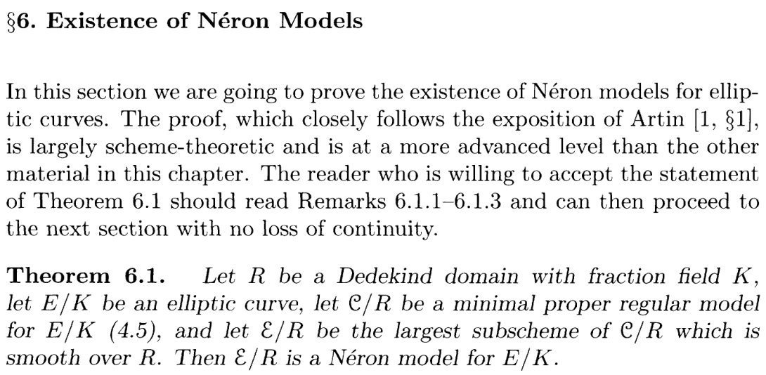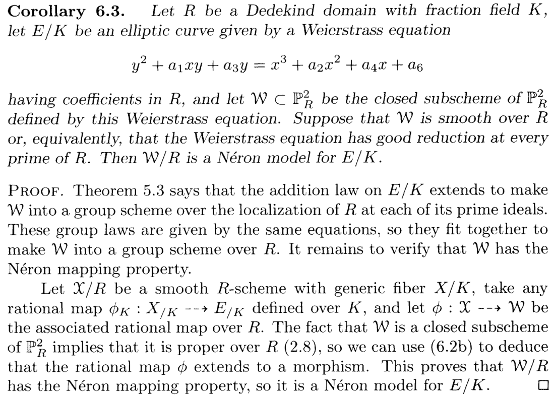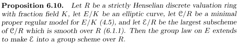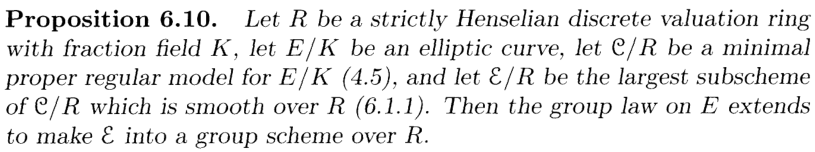 The Theorem IV.5.3c I'm proving with this new approach is exactly from Silverman's chapter on Néron model, and he does cite BLR, so he must be well aware if simplifications are possible using materials in BLR. Yet the only alternative approach to 5.3c (in the case of good reduction) he gave uses the full force of existence of existence of Néron models ( is a group scheme by definition of Néron models):