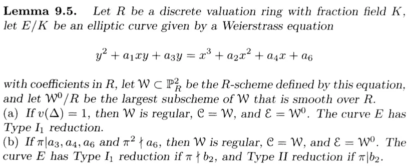 If R is a valuation ring, denote by K its field of fractions and k its residue field. Applying the functor to the quotient map , we obtain a group homomorphism . Since R is a domain, is injective and we may regard as a subgroup of . Since W is proper we always have , and if W has nonzero discriminant then , so we get a reduction homomorphism from a subgroup of to ; if moreover W has good reduction (discriminant is a unit), then and we get a homomorphism .